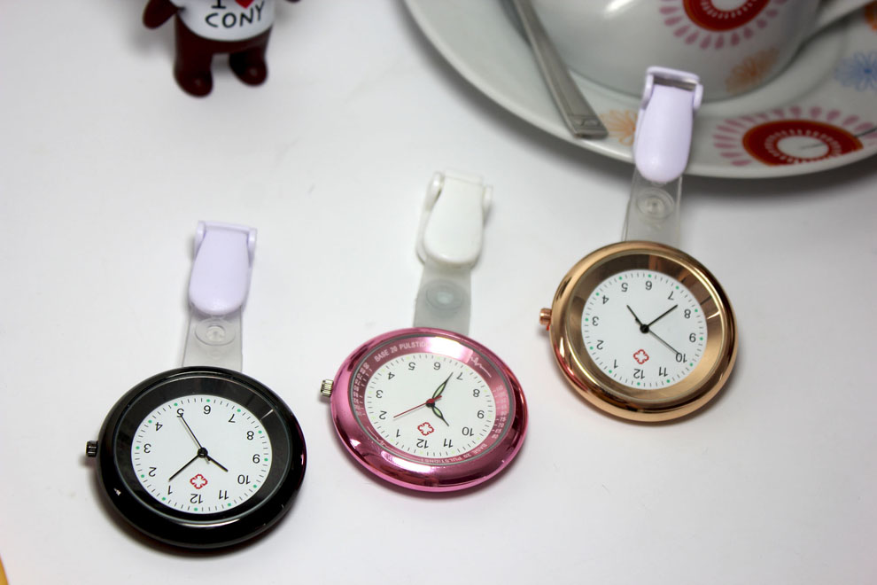 Alloy medical nurse watches, with a safety pin on the back. Suitable to measure patient pulse, beat and sterilization procedure timing. Conforming to procedures not allowing nurses to wear wrist watches.