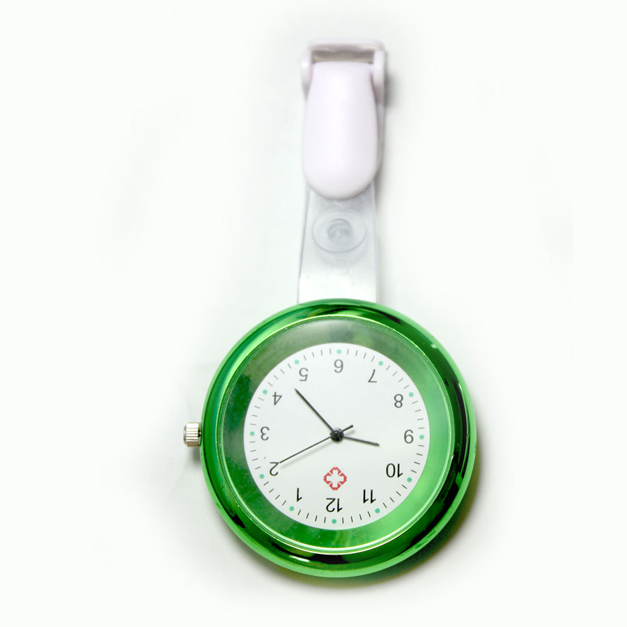 Alloy medical nurse watches, with a safety pin on the back. Suitable to measure patient pulse, beat and sterilization procedure timing. Conforming to procedures not allowing nurses to wear wrist watches.