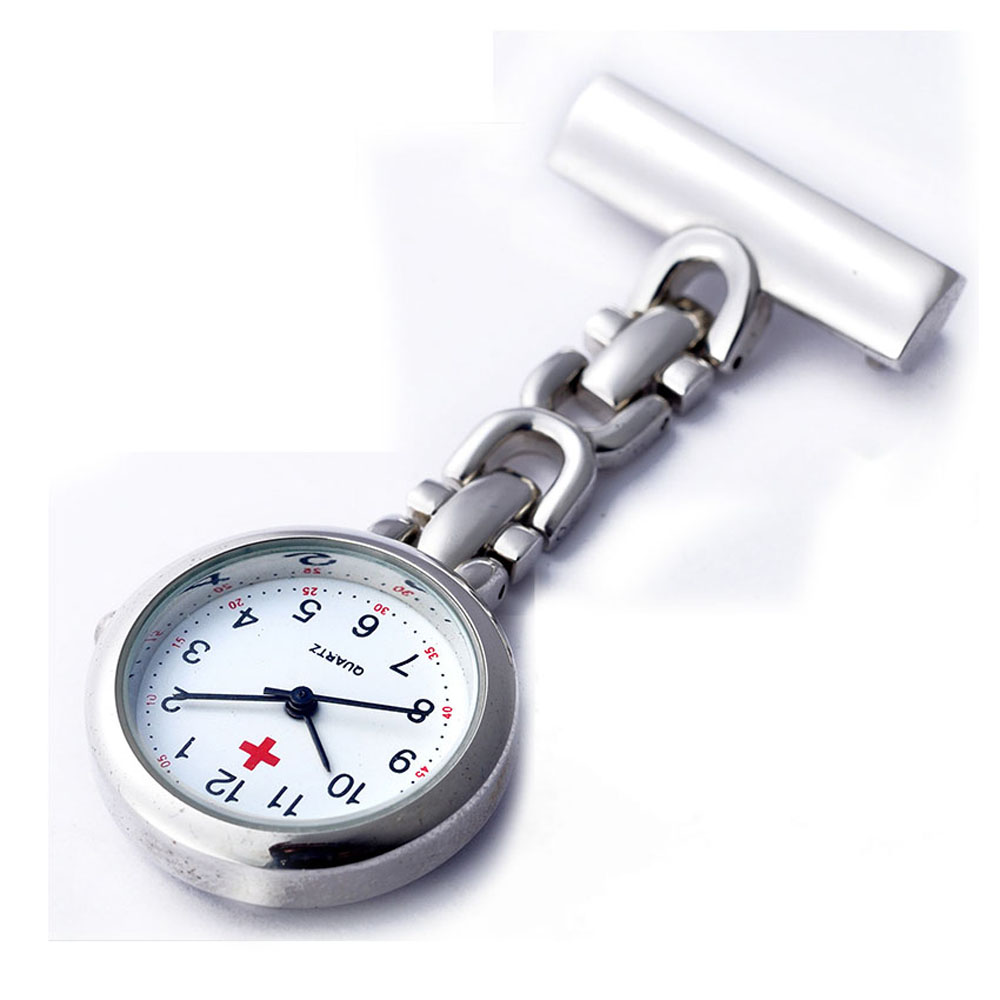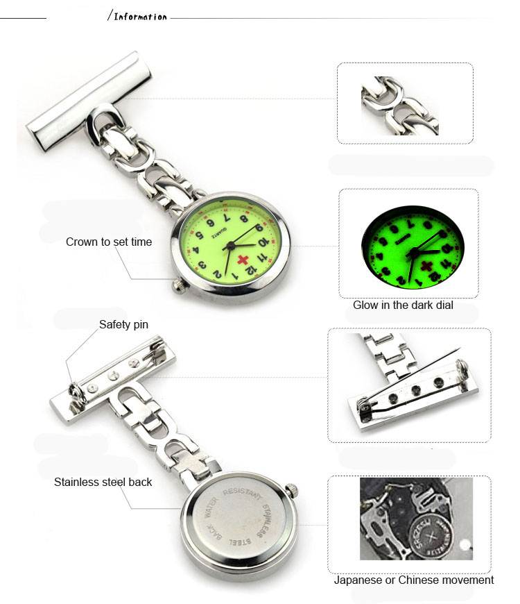 Alloy medical nurse watches, with a safety pin on the back. Suitable to measure patient pulse, beat and sterilization procedure timing. Conforming to procedures not allowing nurses to wear wrist watches.