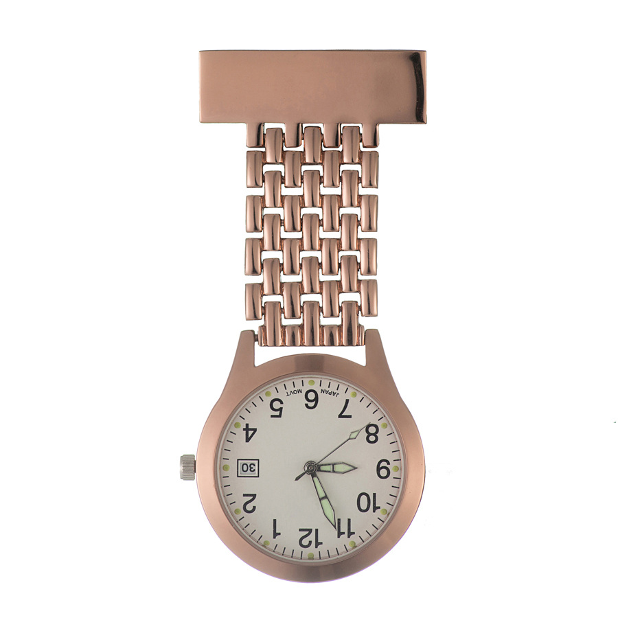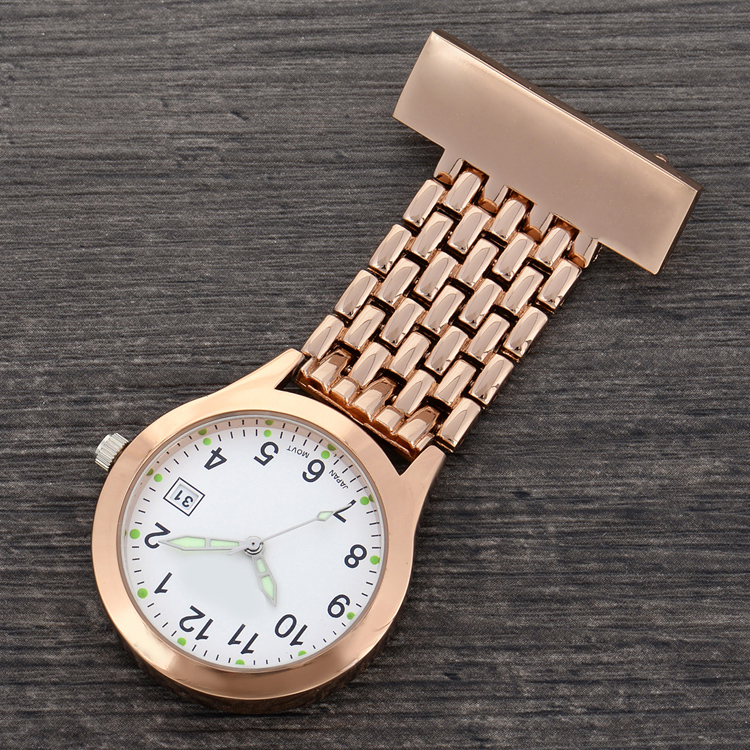 Alloy medical nurse watches, with a safety pin on the back. Suitable to measure patient pulse, beat and sterilization procedure timing. Conforming to procedures not allowing nurses to wear wrist watches.
