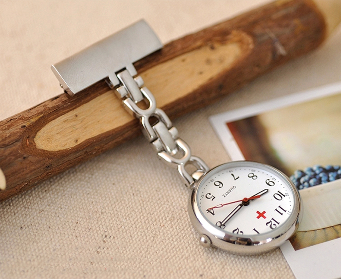 Alloy medical nurse watches, with a safety pin on the back. Suitable to measure patient pulse, beat and sterilization procedure timing. Conforming to procedures not allowing nurses to wear wrist watches.