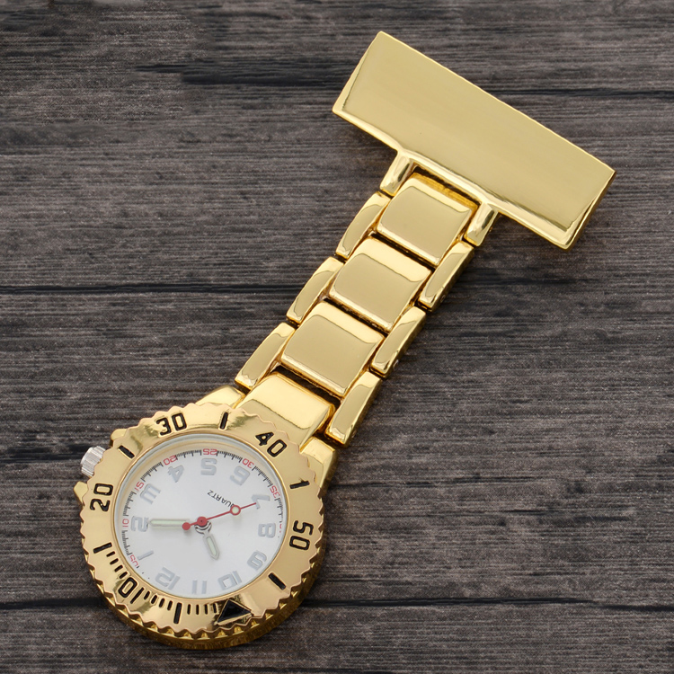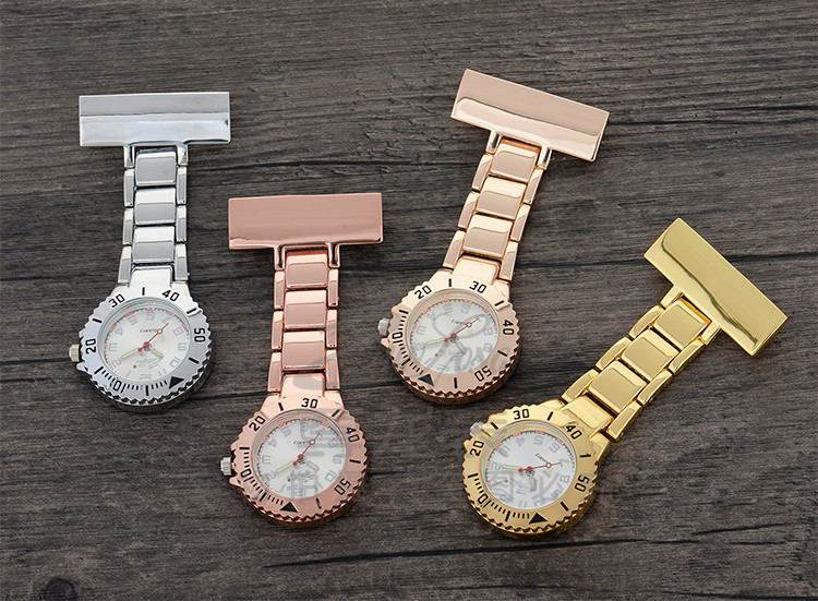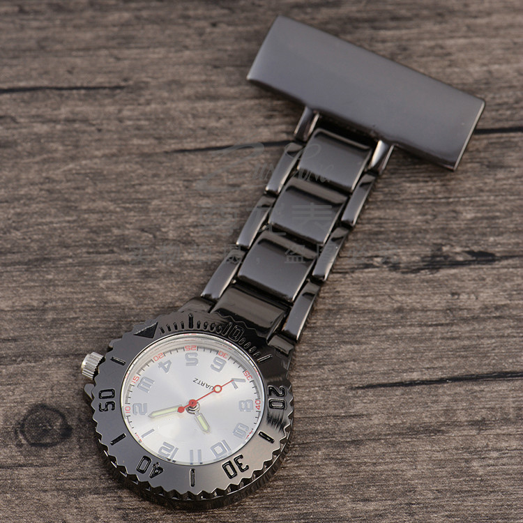 Alloy medical nurse watches, with a safety pin on the back. Suitable to measure patient pulse, beat and sterilization procedure timing. Conforming to procedures not allowing nurses to wear wrist watches.