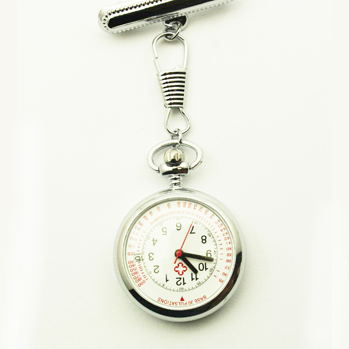 Alloy medical nurse watches, with a safety pin on the back. Suitable to measure patient pulse, beat and sterilization procedure timing. Conforming to procedures not allowing nurses to wear wrist watches.