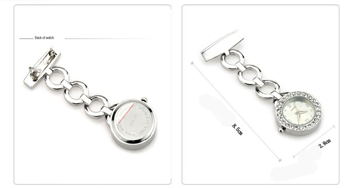 Alloy medical nurse watches, with a safety pin on the back. Suitable to measure patient pulse, beat and sterilization procedure timing. Conforming to procedures not allowing nurses to wear wrist watches.