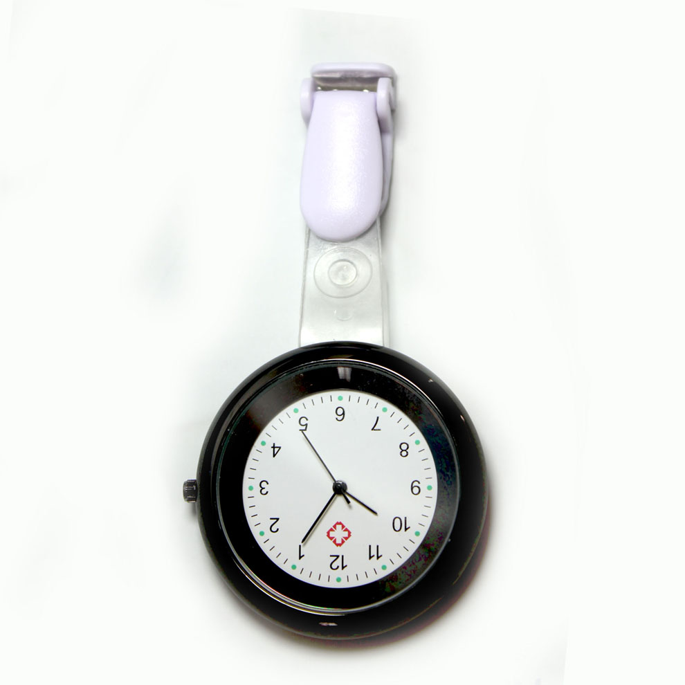 Alloy medical nurse watches, with a safety pin on the back. Suitable to measure patient pulse, beat and sterilization procedure timing. Conforming to procedures not allowing nurses to wear wrist watches.