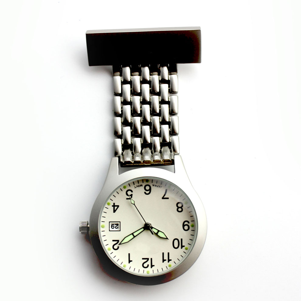Alloy medical nurse watches, with a safety pin on the back. Suitable to measure patient pulse, beat and sterilization procedure timing. Conforming to procedures not allowing nurses to wear wrist watches.