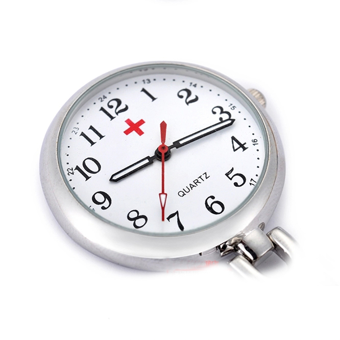Alloy medical nurse watches, with a safety pin on the back. Suitable to measure patient pulse, beat and sterilization procedure timing. Conforming to procedures not allowing nurses to wear wrist watches.