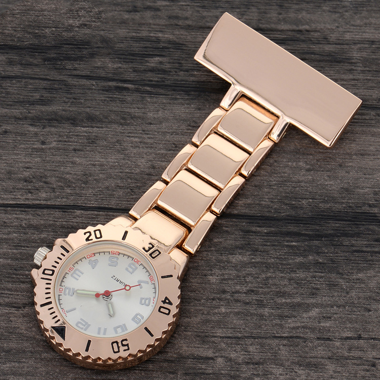 Alloy medical nurse watches, with a safety pin on the back. Suitable to measure patient pulse, beat and sterilization procedure timing. Conforming to procedures not allowing nurses to wear wrist watches.