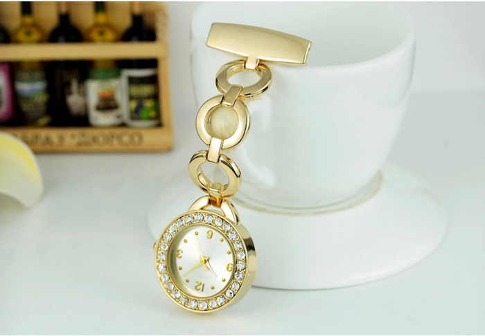 - Product description: SKU#NS2106B Gold plated with shining crystals. Elegant and classic designed nurse watch, with shining stones , basic colors : golden and silver, and also can customize your own colors.